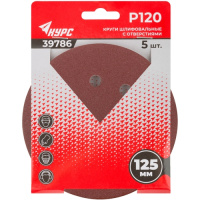 Круги шлифовальные с отверстиями. С ворсовой основой под липучку. Для эксцентриковых машин с пылеотводом. Диаметр 125 мм. Зернистость: 120. В наборе 5 шт.