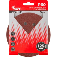 Круги шлифовальные с отверстиями. С ворсовой основой под липучку. Для эксцентриковых машин с пылеотводом. Диаметр 125 мм. Зернистость: 60. В наборе 5 шт.