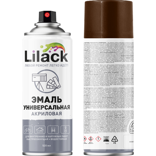 Высококачественная универсальная акриловая глянцевая эмаль LILACK 7101-39 LK коричневая глянцевая используется в декоративно-оформительских работах, строительстве и ремонте. Предназначена для окрашивания: древесины, пластика, металла, бетона, кирпича, керамики, стекла, картона, минеральных поверхностей. Аэрозольная эмаль удобна для окрашивания небольших поверхностей и труднодоступных мест. Образует гладкое, устойчивое к выцветанию покрытие.