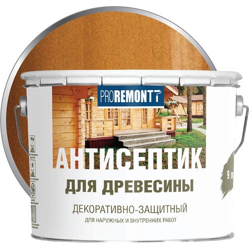 Антисептик ПРОРЕМОНТ тик 9л. На основе алкидного лака. Для обработки внутренних и наружных деревянных поверхностей: фасадов и внутренних стен домов, срубов, садовых строений, заборов, дверей, оконных рам, перил, плинтусов, балконов и других конструкций из дерева, фанеры, ДСП, ДВП от атмосферных воздействий, УФ-излучения (потемнения, выгорания) и грибковых поражений. Выделяет естественную текстуру древесины, тонирует под ценные породы дерева.