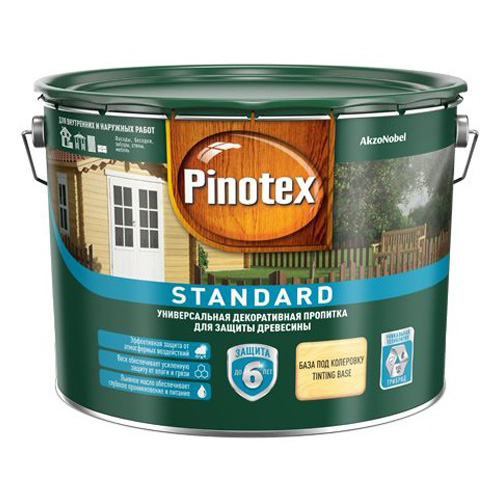 Пропитка ПИНОТЕКС Стандарт сосна 9л. Связующее защитной восковой пропитки разработано с использованием технологии AWB и ТРИБРИД технологии. Пропитка для дерева Pinotex Standard используется как для наружных работ, так и безопасна для применения внутри помещений (универсальная), т.к. не содержит биоцидных добавок, не выделяет вредных веществ. Окрашенная поверхность устойчива к воздействию солнца, дождя, снега и мороза. Pinotex Standard легко наносится и быстро впитывается в поверхность древесины, образуя полуматовое покрытие. Подчеркивает естественную текстуру древесины. Для защиты глубоких слоев древесины от биокоррозии при наружных работах применять восковое покрытие для дерева в системе с грунтовкой Pinotex Base.