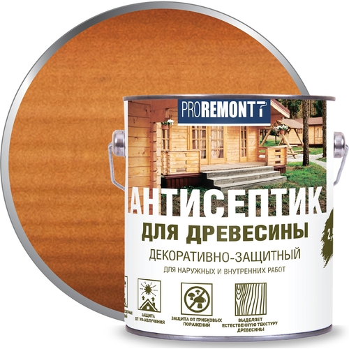 Антисептик ПРОРЕМОНТ махагон 2,5л. На основе алкидного лака. Для обработки внутренних и наружных деревянных поверхностей: фасадов и внутренних стен домов, срубов, садовых строений, заборов, дверей, оконных рам, перил, плинтусов, балконов и других конструкций из дерева, фанеры, ДСП, ДВП от атмосферных воздействий, УФ-излучения (потемнения, выгорания) и грибковых поражений. Выделяет естественную текстуру древесины, тонирует под ценные породы дерева.