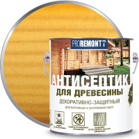 Антисептик ПРОРЕМОНТ орегон 2,5л. На основе алкидного лака. Для обработки внутренних и наружных деревянных поверхностей: фасадов и внутренних стен домов, срубов, садовых строений, заборов, дверей, оконных рам, перил, плинтусов, балконов и других конструкций из дерева, фанеры, ДСП, ДВП от атмосферных воздействий, УФ-излучения (потемнения, выгорания) и грибковых поражений. Выделяет естественную текстуру древесины, тонирует под ценные породы дерева.