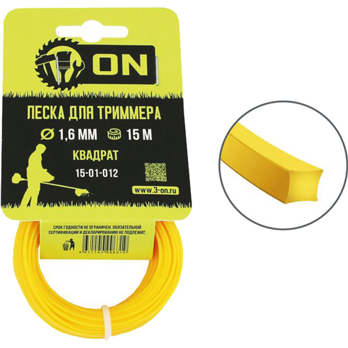 Леска для триммера 3-ON 1,6 мм 15 м квадрат служит расходным материалом для электрических и бензиновых триммеров. Предназначена для скашивания травы и кустарников. Леска изготовлена из 100% российского нейлона, без добавления полипропилена, присадок и иных материалов, разрушающих первозданную структуру материала.