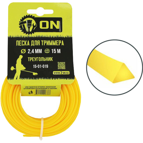 Леска для триммера 3-ON 2,4 мм 15 м треугольник служит расходным материалом для электрических и бензиновых триммеров. Предназначена для скашивания травы и кустарников. Леска изготовлена из 100% российского нейлона, без добавления полипропилена, присадок и иных материалов, разрушающих первозданную структуру материала.