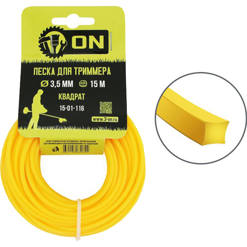 Леска для триммера 3-ON 3,5 мм 15 м квадрат служит расходным материалом для электрических и бензиновых триммеров. Предназначена для скашивания травы и кустарников. Леска изготовлена из 100% российского нейлона, без добавления полипропилена, присадок и иных материалов, разрушающих первозданную структуру материала.